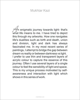 A naturally gifted artist, Mukhtar Kazi born in 1977 who holds a diploma in Art ,is extremely versatile in his subjects and pours his life experiences into it. His works showcase his flair for painting in different media.