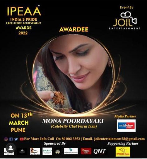 Mona Poordaryaei from Iran was recently Honoured with IPEAA Awards 2022 In Pune organised by Joil Entertainment. Mona Poordaryaei is a welknown Chef from Iran.