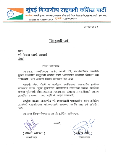 गत 2 मई 2022 देवन शशी आचार्य उर्फ़ देवा अन्ना को आजीवन याद रहने वाली है, अन्ना को इस दिन राष्ट्रवादी कांग्रेस पार्टी में असंघठित कामगार विभाग के मुंबई अध्यक्ष नियुक्त किए गए, सांसद सुप्रिया सुले व मुंबई कार्याध्यक्ष राखीताई जाधव के हस्ते नियुक्ति पत्र सौपा गया |