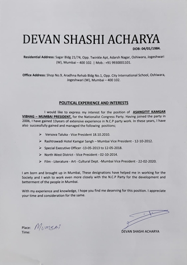 आपको बता दे की देवन शशी आचार्य को 18 -10 – 2010 को वर्सोवा तालुका का उपाध्यक्ष पद से करवा शुरू हुआ फिर राष्ट्रवादी होटल कामगार संघ मुंबई उपाध्यक्ष का पद 12 -10 -2012 को तो एसइओ 2013 से 2018 बने रहे इस बिच 2014 में उतर पश्चिम जिल्ला में उपाध्यक्ष नियुक्त किये गए, और फिर 2020 में चित्रपट – साहित्य, कला और सांस्कृतिक विभाग में देवन शशी आचार्य को मुंबई उपाध्यक्ष की कमान सौपी गयी |