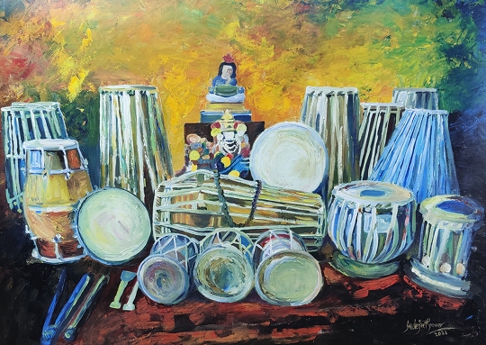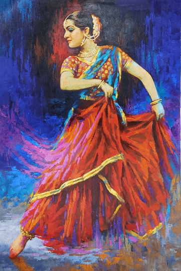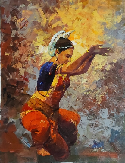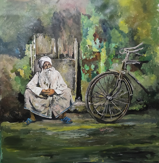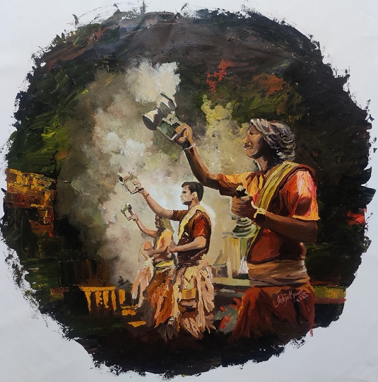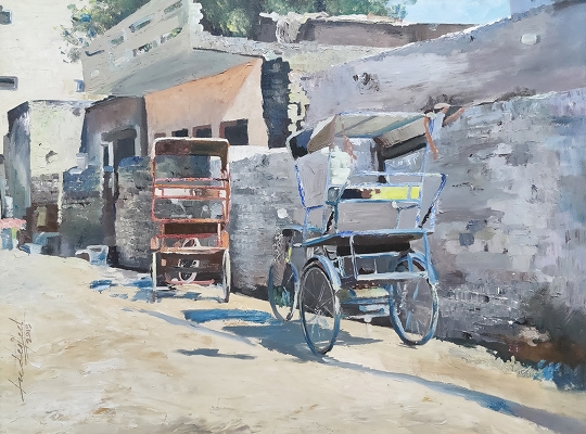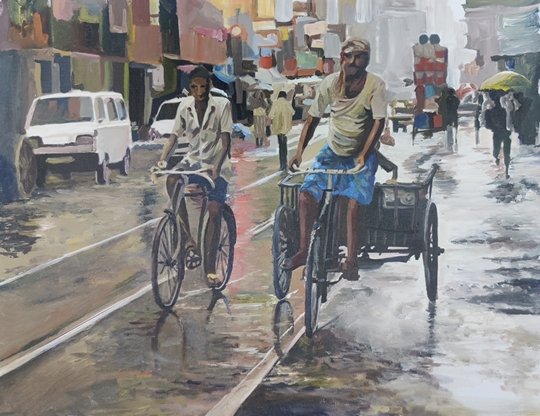 His paintings, rendered in impressionist style, employ thick pigmented strokes applied with great virtuosity, revealing a style that is at once free and highly constructed. These works showcase the countryside, its landscapes, the people, their daily lives, their emotions, joys and worries engaged in daily activities, such as an old man waiting near his door, an old lady engaged in cooking food, the cycle rickshaws outside the house, facial emotions of dancers during their dance, various musical instruments.