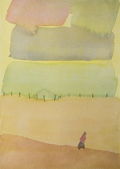Illness in old age is always a transformation. Subhash has spent time near a lake in Bhor on the Western Ghats of Maharashtra. This plateau-esque terrain with valleys and a reservoir is stationary in time. Watercolours from here capture Awchat’s view of the Sky as blue.  He sees homes dwarfed under the horizon of the Sun. His monk-like figures run under colourful buntings that have affinities of form with geometrical abstraction. We realise how he uses space in his canvases; a particular work divided the paper into a palette of pastels. He is not using ochre. Brown is not to be seen, instead, bright Yellows, Pinks and Light Blues fill spaces where he doesn’t find forms.  A social person finally finds in the landscape a form to draw solitude.