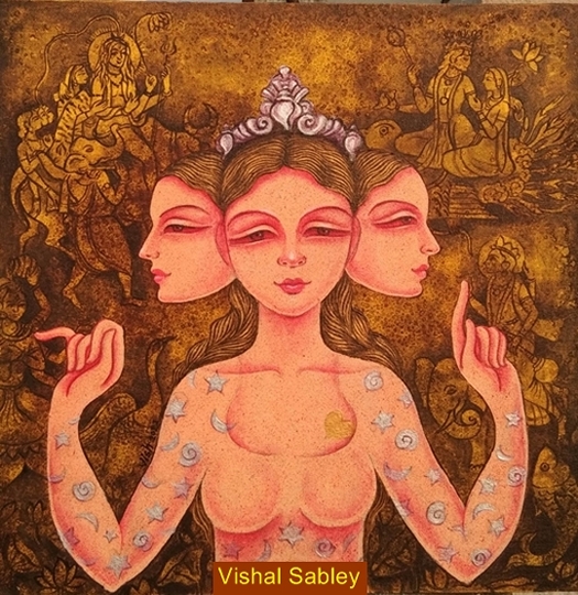 The inspiring force behind the works by B Meghmala, Deepak Mukherjee, Monalisa Parikh, Namrita Nagra, Paridhi Jain, Sayali Nagarkar, Sudha Ramkrishnan, Vikram Bhatti, Vinayak Nigam and Vishal Sabley is their belief and faith that prompted them to create an impressive and wondrous works of art which generates mystical aura and spiritual vibrations around them. The amount of detailing in sculptures by Devel Sharma, Pankaj Gadakh, Soumen Kar, and Sujit Kumar Mukhopadhyay