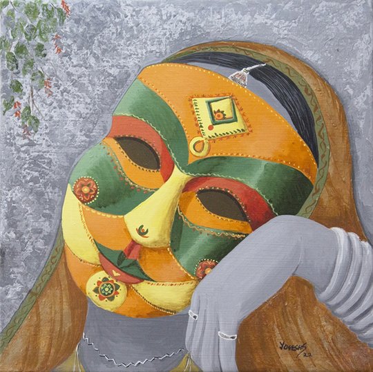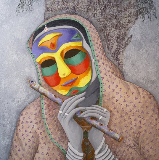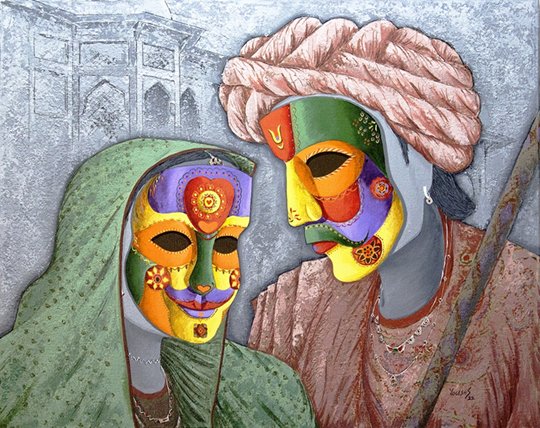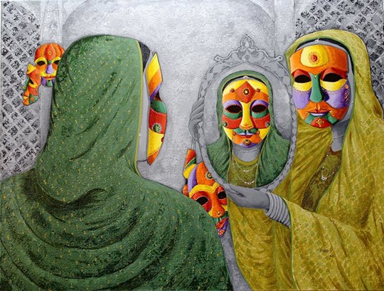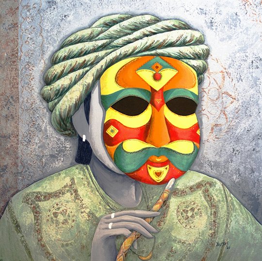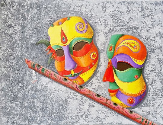 He has aesthetically and adorned his works showing vivid masks to reveal different feelings in human mind like happiness, curiosity, excitement, innocence, dejection, enthusiasm, pangs of separation, sadness, gloom, masculinity, dominance, anger, hatred, femininity and many more. He has shown these iconic motifs on the faces of the living creatures that resemble human beings, animals, birds and all alike. These depict intense vulnerability and intention of human beings to hide their real personality and mindscape by putting up the various masks in order to safeguard themselves from different catastrophes or unpleasant/problematic situations and happenings in their life. He has tried to show the anatomical features showing various moods of the character as well as characteristics and peculiarities of their inner feelings in apt perspectives. He has artistically shown various designs of masks put up by human beings on their faces for security, privacy, pride, ego, vanity, respect, fun and many more. He has created the desired visual effects in his work by using various layers of apt colours and his skilful technique using palette knife and other means in order to adorn them with the expected sentimental mindscapes of the character in the requisite perspectives of visual arts.