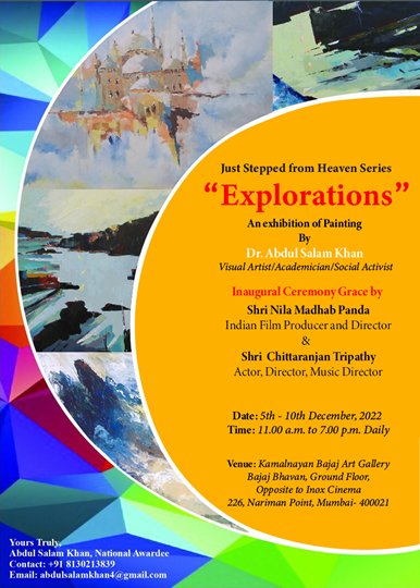 A well known contemporary artist Dr. Abdul Salam Khan will display his recent innovative work on Beauty of Nature and its myriad facets in a solo art exhibition at Kamalnayan Bajaj Art Gallery, Bajaj Bhavan, Nariman Point, Mumbai 400021 from 5th to 10th December, 2022 between 11 am. To 7 pm. It will showcase his work in Acrylic colours and mixed medium on canvas to depict the eternal and omnipresent beauty of Nature and the myriad facets thereof in the form of paintings made by him in his unique style through artistic and aesthetic amalgamation of impressionism and realism in the relevant perspectives of visual arts.