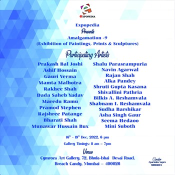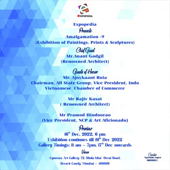 Expopedia – a Mumbai based art promotional institution presents ‘Amalgamation – 9’ group art exhibition of paintings & sculptures made by 24 artists under one roof at Cymroza Art Gallery, Bhulabhai Desai Road, Mumbai from 16th to 19th December 2022. This show is curated by Aparimita Sapru who aims to thereby promote these artists – both senior and professional alongwith upcoming talented ones and their artworks globally so as to reach the prospective buyers and collectors of visual fine arts. The variety of works presented here include figurative, landscapes, abstracts, monuments and spiritual ones in different mediums.