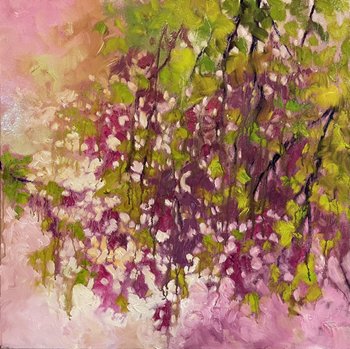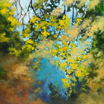 The works are rendered in oil on canvas and present a perspective of moods, often expressed using colours which are vibrant or subdued, playful and sombre. This oscillation between the opposites of the colour palette adds to the play of depth, light, movement and a sensorial experience which can resemble the real changes of season. Bhatt’s application of paint is vaguely reminiscent of the Impressionists who aimed to capture the characteristic essence of a scene, focusing on the way light changes the nature of an object and makes it anew. Bhatt’s skill seems to warrant such commendation too, as one looks at these works intently, one could experience a fleeting movement of the foliage. It has to be attributed to the impasto brush strokes, especially when they lead the eye around the work and a mental journey all at once.