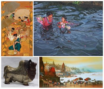 This show will depict the various works in realistic, Semi-realistic, abstract, surrealistic and contemporary as well as modern style in different mediums such as oil colours, acrylics,watercolors, etching, dry pastels and oil pastels, pen and ink, mix media etc and sculptures in bronze, metal relief scraps and mix media in the unique techniques and styles adopted by the participating artists. The works displayed in these show include landscapes, cityscapes, seascapes, beauty of nature, seasonal highlights of nature, historical monuments and their traditional heritage, figurative works showing various sentimental feelings on the faces of young sensitive women in their perspectives realms of life, Journey of life, Market Place, vignettes of rural and Urban culture, icon of powers and many more thematic peculiarities.
