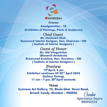 A Mumbai based art promotional institution- Expopedia has showcased a group art exhibition of paintings, sculptures and prints at Cymroza Art Gallery, 72, Bhulabhai Desai Road, Breach Candy, Mumbai 400026 from 19th to 22nd April 2023 from 11 am to 7 pm.