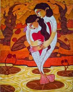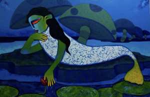 At the heart of his narrative lies the story of Matsyagandha and her lover, brought to life through intricate details and a dreamlike backdrop. Kumavat’s mastery lies in striking a harmonious balance between materialism and fantasy, exemplified by the simplicity of his central characters against the backdrop of water ripples and aquatic imagery.