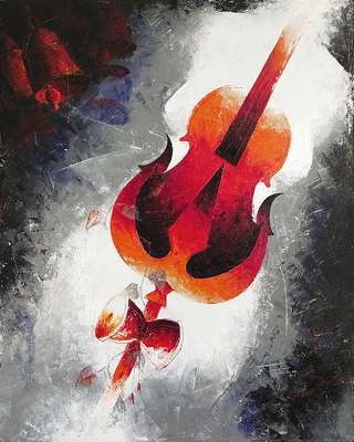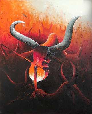 The Series presented by Pavan Kumar Attavar elaborates the relevance and sanctity of white space or highlights and dark areas or depth. Having been greatly influenced by high notes and low note in Music and their effect on the listeners and all alike, he has incorporated the same inspiration from music in his artwork using apt colour tones and their rhythmic harmony. His work prominently highlights, the Violin in particular along with other instruments like Damru and Trident and their tonal resonance in orderto spread the fragrance and rhythm of music along masses. Making an optimum and iconic use of bull and other relevant ingredients at strategic arenas in the work, he has demonstrated his skill and command over the medium used in order to render ample contentment and divine tranquillity to all. Using the mythological background, he has focussed on the sanctity and relevance of both vibrations and resilience as well as tranquillity in the divine music – aptly called the 5th Ved or Pancham Veda to make the overall humanity happy and exhilarating as well as joyful in the apt perspectives of visual arts.