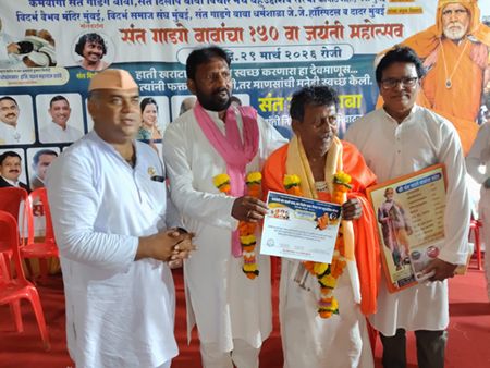 Dignitaries honored included Ashfaque Khopekar, MLA Balaram Patil, Ashok Barabde, Gajananrao Nage, Purushottam Bhuyar, Uttamrao Lonar, corporators Vikas Gharat and Happy Singh, and others. They were felicitated with shawls and Gadge Baba mementos by Saint Dilip Baba. The event included a community dinner (Bhandara).